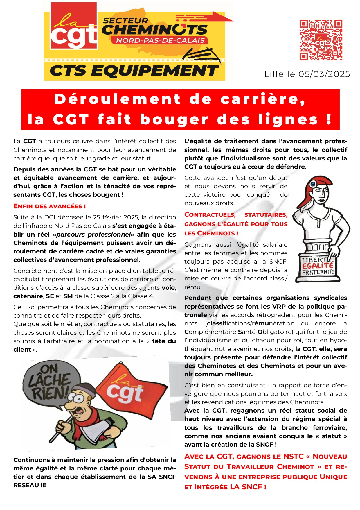 Suite à la DCI déposée le 25 février 2025, la direction de l’infrapole Nord Pas de Calais s’est engagée à établir un réel «parcours professionnel» afin que les Cheminots de l’équipement puissent avoir un déroulement de carrière cadré et de vraies garanties collectives d’avancement professionnel.