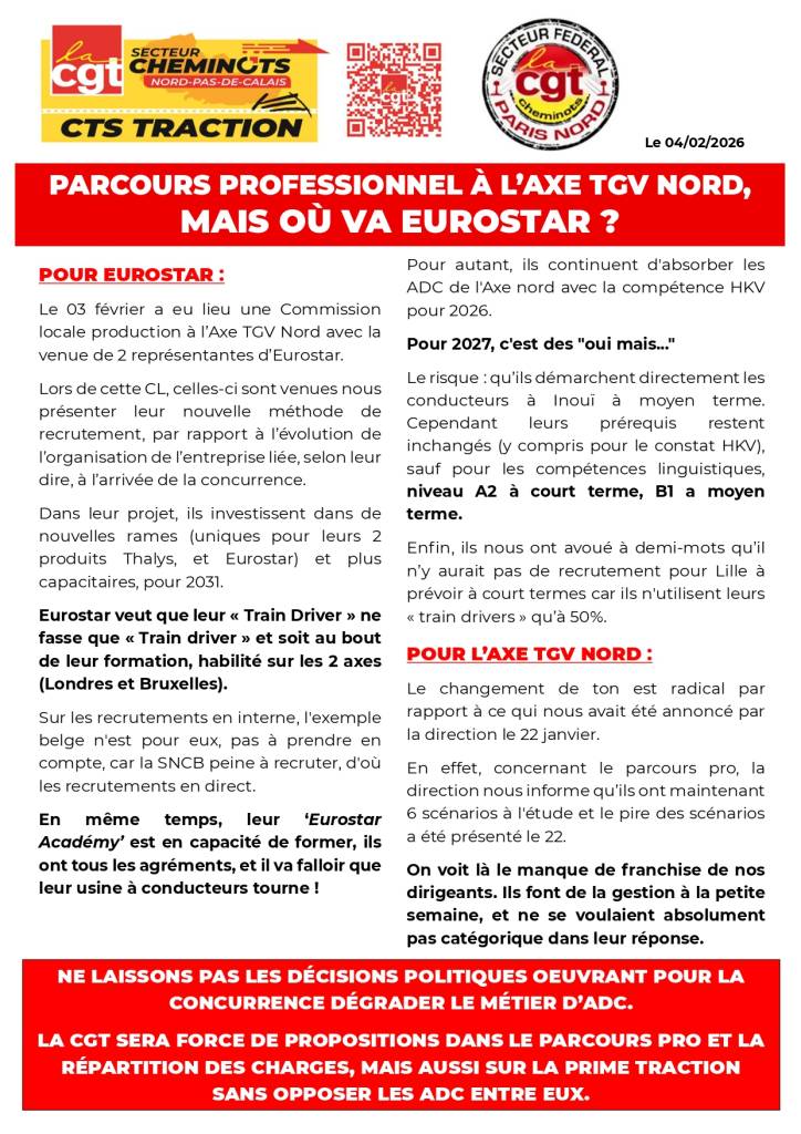 LA CGT SERA FORCE DE PROPOSITIONS DANS LE PARCOURS PRO ET LA RÉPARTITION DES CHARGES, MAIS AUSSI SUR LA PRIME TRACTION SANS OPPOSER LES ADC ENTRE EUX.