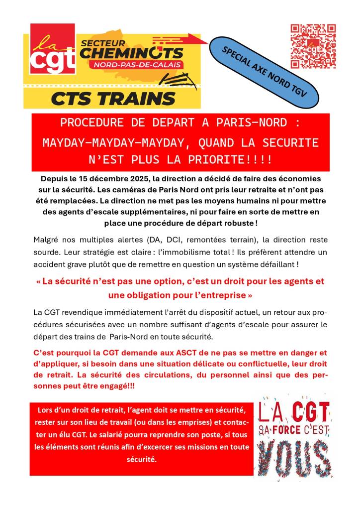 La CGT revendique immédiatement l’arrêt du dispositif actuel, un retour aux procédures sécurisées avec un nombre suffisant d’agents d’escale pour assurer le départ des trains de Paris-Nord en toute sécurité.